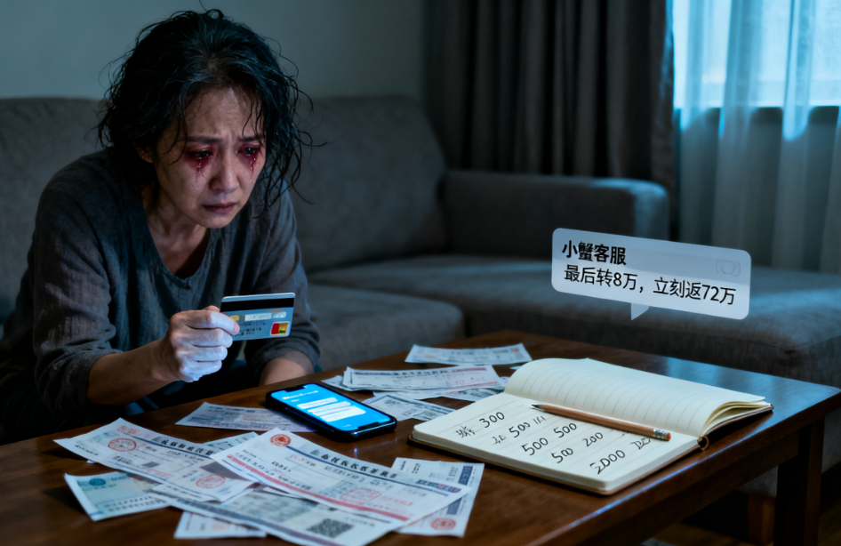 接下来的半个月,钱阿姨像被 “小蟹客服” 牵着鼻子走。“姐,系统检测到您的任务流水不够,得再转 1 万元冲流水,不然返现会延迟!”“钱姐,财务说您的账户有‘异地转账记录’,得补缴 3 万元‘安全验证金’,不然账户会被冻结!”“阿姨,这次是真的最后一次了!您转 15 万元‘VIP 升级费’,升级后立刻解锁所有返现,连之前的钱加起来,一共能返您 72 万!”每次 “小蟹” 发来消息,钱阿姨都觉得 “这是最后一次”。她开始瞒着老伴找亲戚借钱 —— 找妹妹借了 8 万,找侄女借了 5 万,甚至把存在银行的 20 万定期存款提前取了出来,损失了几千块利息也顾不上。11 月 8 日那天,“小蟹” 发来消息,语气比之前更急切:“阿姨,财务那边刚通知,您的返现申请已经通过了,但需要最后一笔‘回款手续费’8 万元。您转完这 8 万,我立刻让财务把 72 万转到您的银行卡里,半小时内到账!这次绝对是最后一次,我以我的人格担保!”钱阿姨看着手机,手里攥着最后一张银行卡 —— 里面是她和老伴的 12 万 “救命钱”,是留着看病用的。她犹豫了,这半个月来,她已经转了 50 万,要是再转 8 万,就只剩 4 万了。“阿姨,您别犹豫了!财务下班前必须把回款办完,要是错过今天,您之前的 50 万就只能等明年了!”“小蟹” 发来一个 “哭” 的表情包,“我知道您不容易,可这是最后一步了,您再坚持一下!”钱阿姨坐在沙发上,眼泪掉了下来。她想起儿子小时候,自己省吃俭用给儿子买奶粉;想起老伴去年住院,她攥着银行卡在缴费处发抖;想起这些天,她骗老伴 “钱存在朋友那赚利息”,老伴还嘱咐她 “别被骗了”。她擦干眼泪,点开手机银行,输入了 “80000”,手指按在 “确认” 键上,迟迟没敢按下去。突然,手机弹出一条反诈短信:“【反诈中心提醒】凡是要求‘先转账做任务’‘补缴押金才能返现’的,均为刷单诈骗!如已转账,请立即拨打 110 报警!”这条短信像一盆冷水,浇醒了钱阿姨。她猛地反应过来 —— 半个月来,“小蟹” 只让她转钱,从没提过 “大闸蟹礼盒”;每次说 “最后一次”,却总有下一次;那些 “返现截图”“系统提示”,会不会都是假的?她颤抖着给 “小蟹” 发消息:“你是不是骗子?我不转了,你把钱还给我!”没等回复,她又发了一条:“你要是不还钱,我就报警了!”这次,“小蟹” 没再秒回。钱阿姨等了 10 分钟,再发消息时,屏幕上跳出一行字:“对方已将你拉黑,无法发送消息。”聊天界面的头像还是那个扎羊角辫的卡通女孩,可再也不会发来 “钱姐好呀” 的消息了。钱阿姨瘫坐在沙发上,手机从手里滑落到地上,屏幕亮着,上面是她半个月来的转账记录:300、500、2000、3000、5000、10000、30000、150000、80000…… 加起来,整整 582800 元。“老伴……” 钱阿姨声音嘶哑地喊,老伴从厨房出来,见她满脸泪水,赶紧过来扶:“怎么了这是?出什么事了?”钱阿姨抱着老伴,哭得像个孩子:“我被骗了…… 咱们的养老钱,还有借亲戚的钱,一共 58 万,都没了……”