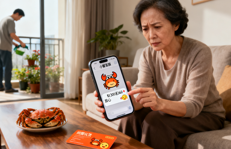 老伴凑过来看,钱阿姨戴上老花镜,掏出手机对着二维码扫了一下。页面跳转到一个没见过的聊天界面,头像不是常见的 APP 图标,而是个扎着羊角辫的卡通女孩,昵称叫 “小蟹客服”。没等钱阿姨说话,“小蟹客服” 先发来消息,语气热络得像认识多年的晚辈:“钱姐好呀!我是蟹农合作社的客服小蟹~您扫的是咱们的专属福利码,除了兑换大闸蟹,完成 3 个小任务,还能赚零花钱呢!任务超简单,就是帮商家推广下,几分钟就能搞定~”