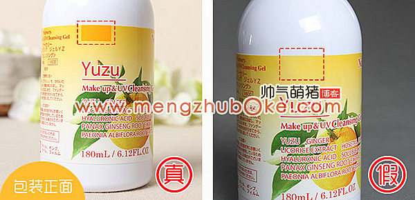 最后就是我们看正包装,猛一看却是没什么变化,非常像,细致地比对后终于明白,原来是这里——上图中加框的位置,正品包装正面在文字“Yuzu”的上方有一个橙色的长方形块,而假货的文字“Yuzu”上方是没有的。