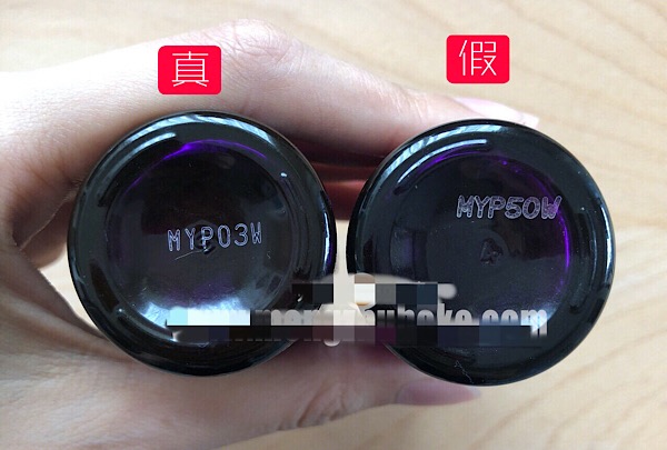 瓶底产品编号的字体,真假差异挺大的,正品的编号就是白色加粗居中字体,仿货呢就是更具有艺术感的,位置偏向瓶底上方的字体。