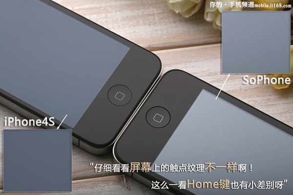 继续用放大镜看看小差别,iPhone 4S的HOME键边缘缝隙要比Sophone的细腻一些。