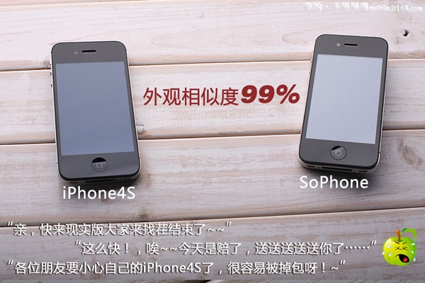 你要真相信你就2了,这又是一款跟着乔老爷混的产品,号称最逼真iphone 4S — Sophone,它已经不仅仅是一个山寨手机,已经成为一种山寨的态度了。不知道乔老爷在船上看到会作何想?